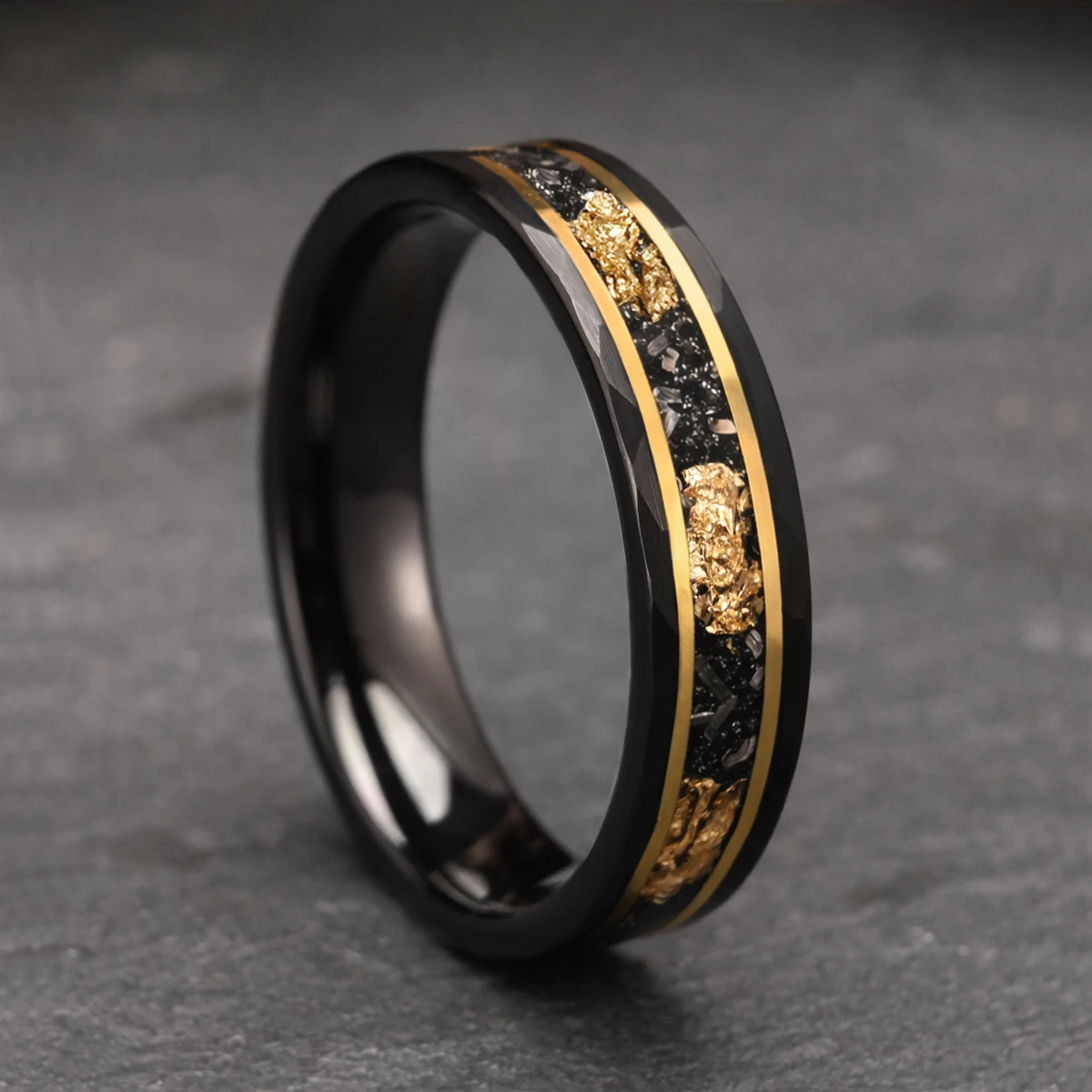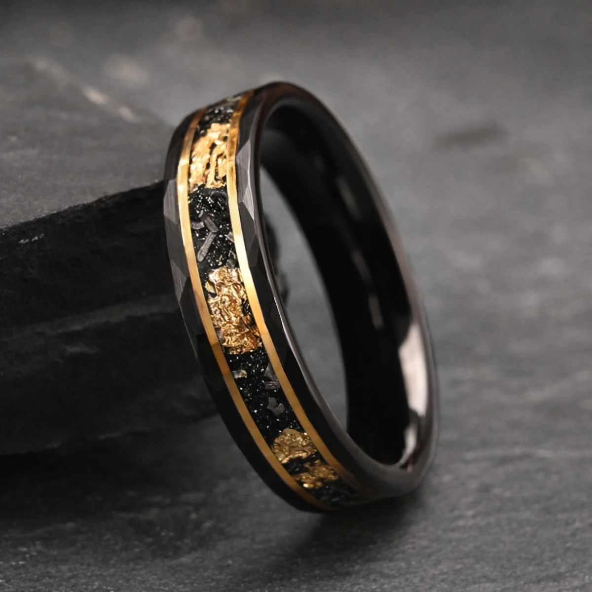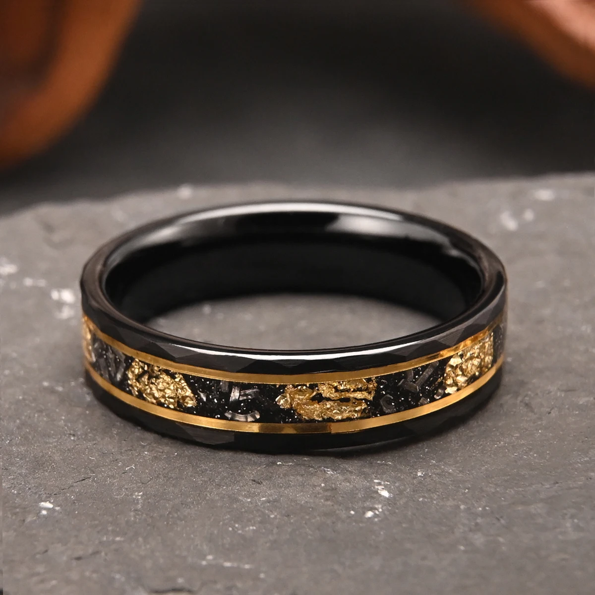 Inlaid with real gold foil and meteorite chips, this tungsten carbide ring blends luxury with a modern, cosmic-inspired texture.✨ The faceted edges reflect light from every angle, while the polished inner comfort-fit makes it ideal for daily wear.