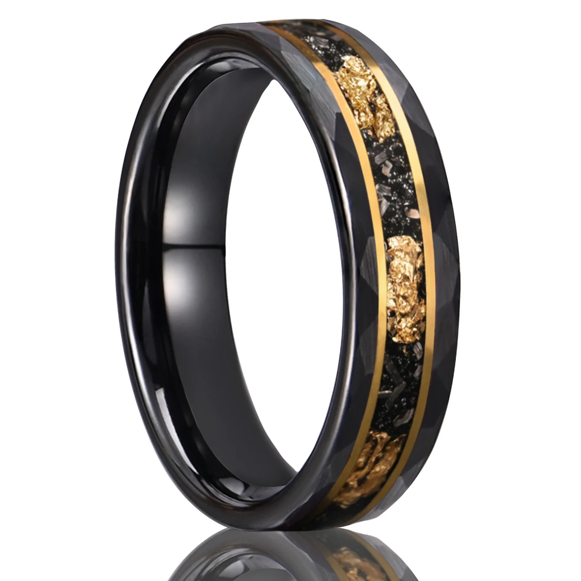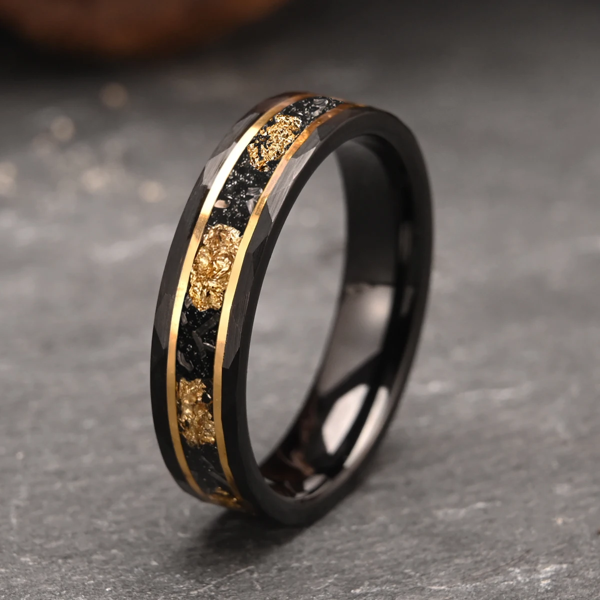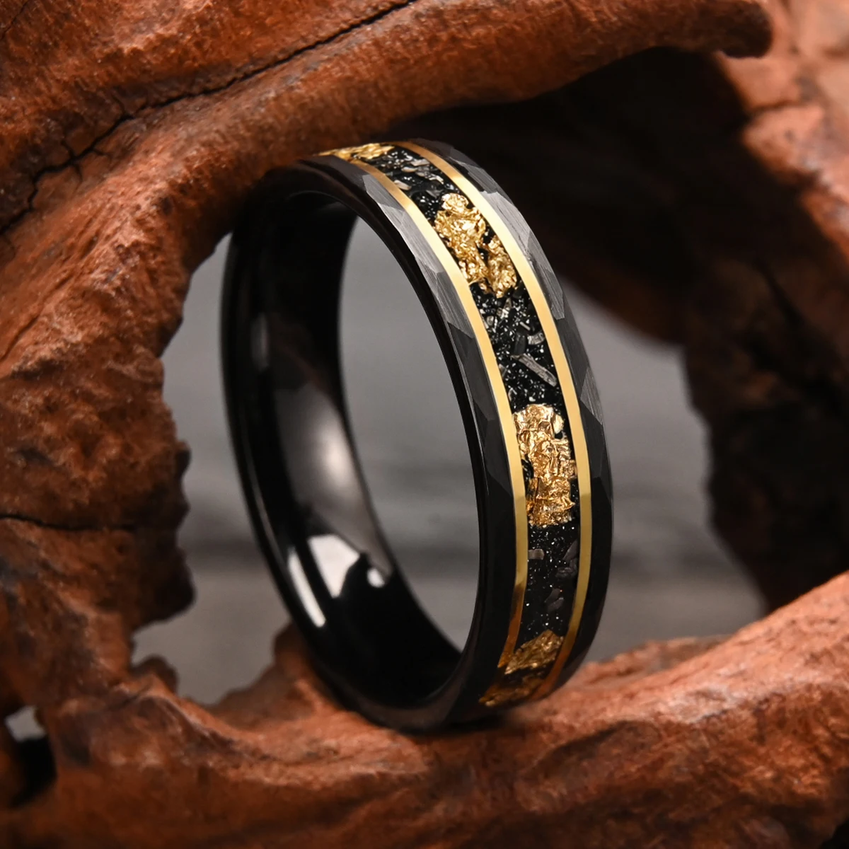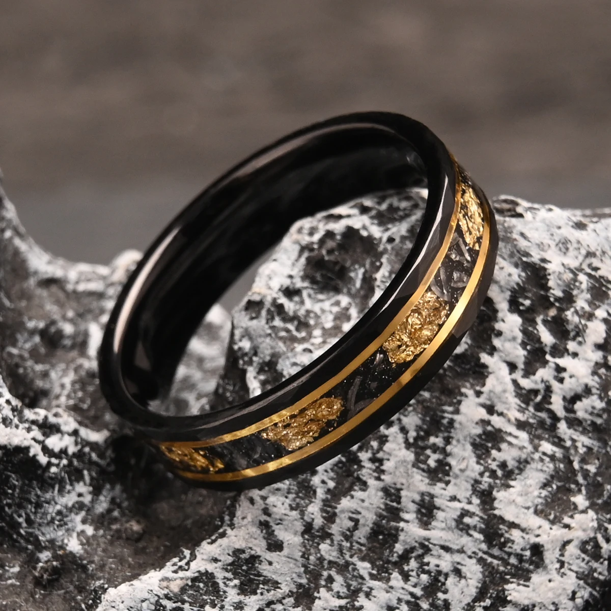 Inlaid with real gold foil and meteorite chips, this tungsten carbide ring blends luxury with a modern, cosmic-inspired texture.✨ The faceted edges reflect light from every angle, while the polished inner comfort-fit makes it ideal for daily wear.