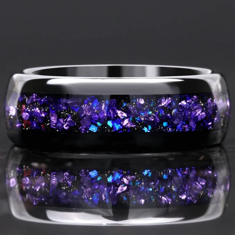 This men’s black tungsten carbide ring is designed for those who value durability, style, and meaning. Featuring a deep black polished finish with a striking amethyst and gold foil inlay, it delivers a bold yet elegant look suitable for daily wear and lifelong commitment.