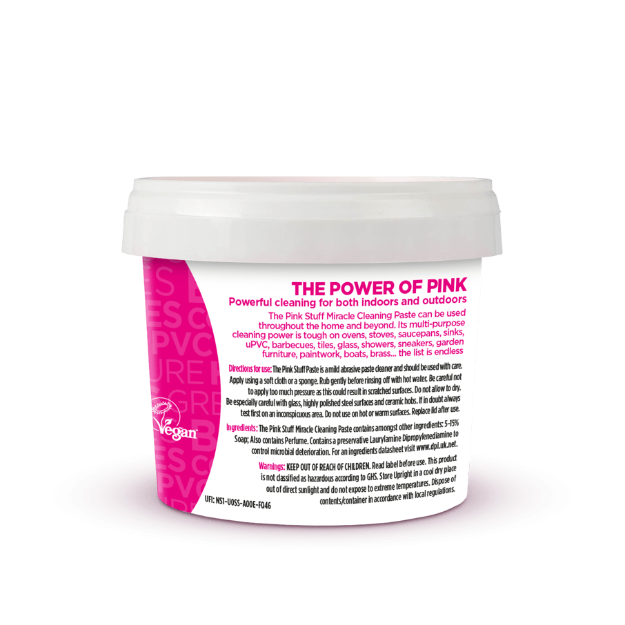 The Pink Stuff Miracle Cleaning Paste is perfect for cleaning dirt, grime and stains on saucepans, cooker tops, sinks, uPVC, barbecues, ceramic tiles, glass, showers, garden furniture, paintwork, boats and brass… the list is endless.